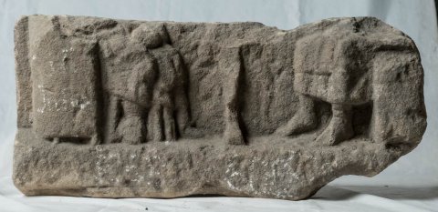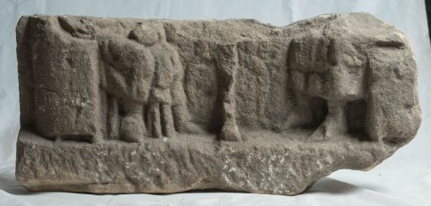 - Totenmahl: links in Lehnsessel sitzende Frau mit Kleinkind auf dem Schoß (?), in der Mitte dreibeiniger Tisch, rechts sitzender Mann.