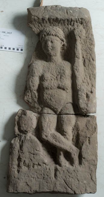 - Mythische Figur: nackte männliche Figur mit kurzen Locken, im linken Arm Stab, in der gesenkten Rechten Geldbeutel (?). Mercur ?