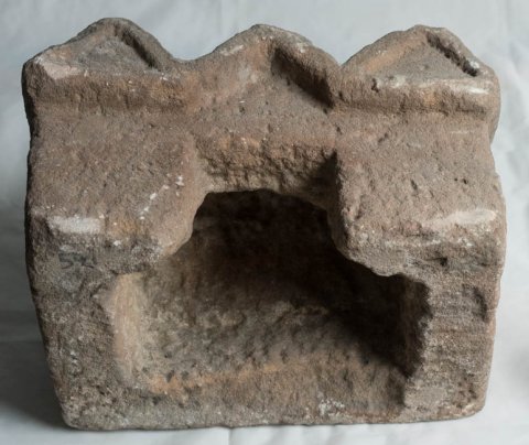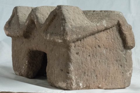 - Häuschen ohne Boden, asymmetrisches Satteldach, auf einer Längsseite drei Giebel, unter dem mittleren rechteckige Türöffnung. Abdeckung einer Aschenurne ?