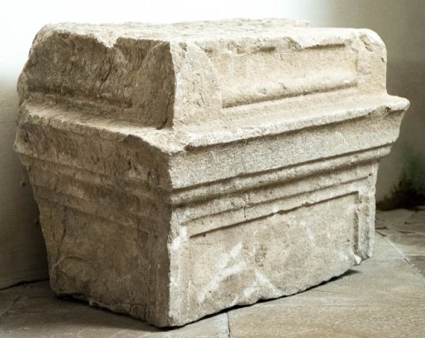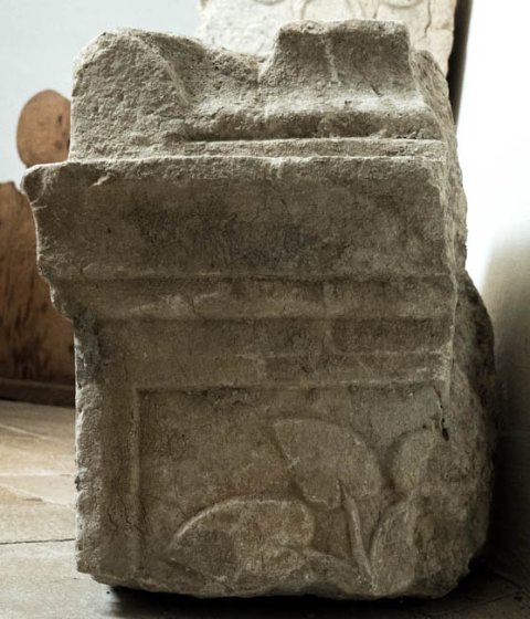 - Aufsatz mit Eckakroteren, profiliert gerahmte Neben- und Rückseite, auf der linken Nebenseite Blätter (Baum ?);