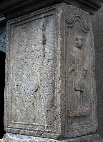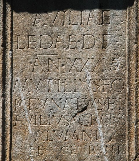 - D(is) M(anibus) / Aviliae / Ledae d(e)f(unctae) an(norum) XXXV / Mutilius Fo/rtunatus et / Avilius Gratus / alumni / fecerunt