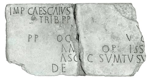 - Imp(erator) Caes(ar) Gaius [---] / max(imus) [---] trib(unicia) p(otestate) P X[---]LI[---] / [---]C[---]R M[---]VIV[---] / [---]P P proc(onsul) [---]VRC[---] / [---]AM[---] nobiliss[imi ---] / [---] Tasg[aetinum? ---]C sum(p)to su[o ---] / [---]EI(?)IDE[---] / [---