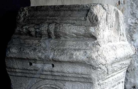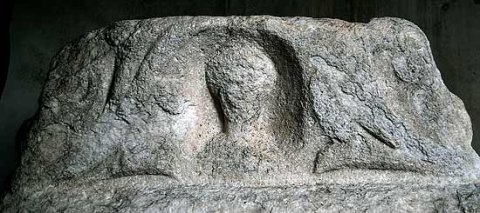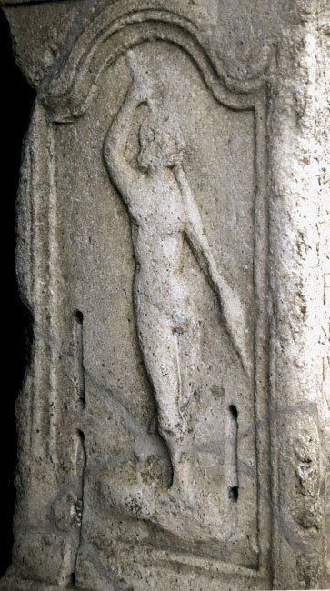 Als Bekrönung Volutenpolster (pulvini), zwischen den Voluten Büste eines Kindes (?) in Bogennische.