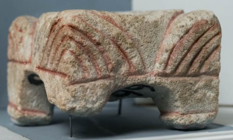 - runde Schale zwischen vier kubischen Füßen, über den Ecken Akrotere mit vertieften Linien;