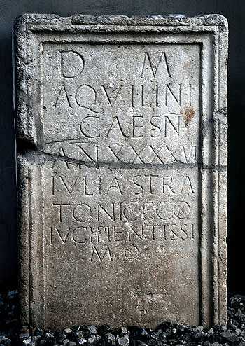 - D(is) M(anibus) / Aquilini / Caes(aris) n(ostri servi) / an(norum) XXXXVI / Iulia Stra/tonice co(n)/iugi pientissi/mo
