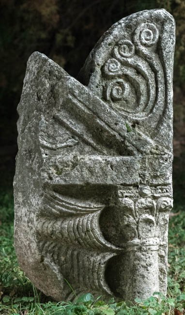 - Giebel mit Gorgoneion, Eckakroter mit Palmette. Bildfeld zwischen Säulen, darin Rest einer Muschel;