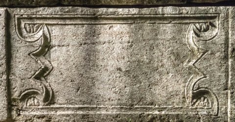 - Dachförmiger Deckel mit Akroteren. Gerahmtes Schriftfeld (seitlich vereinfachtes Berockmotiv), geglättete rahmenlose Seitenfelder.
