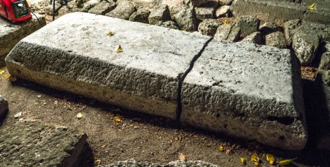 - Block vom Sockel einer Statuenbasis, Seiten abgeschrägt;