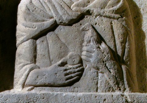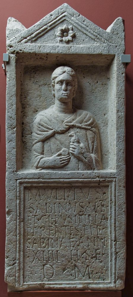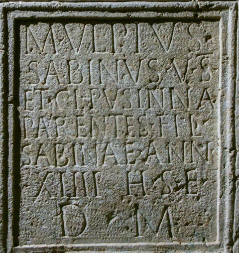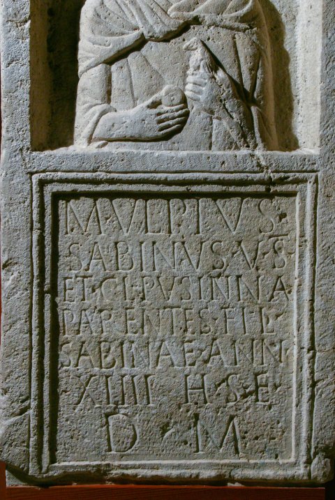 - M(arcus) Ulpius / Sabinus v(ivus) s(ibi) / et Cl(audia) Pusinna / parentes fil(iae) / Sabinae ann(orum) / XIIII h(ic) s(ita) e(st) / D(is) M(anibus)