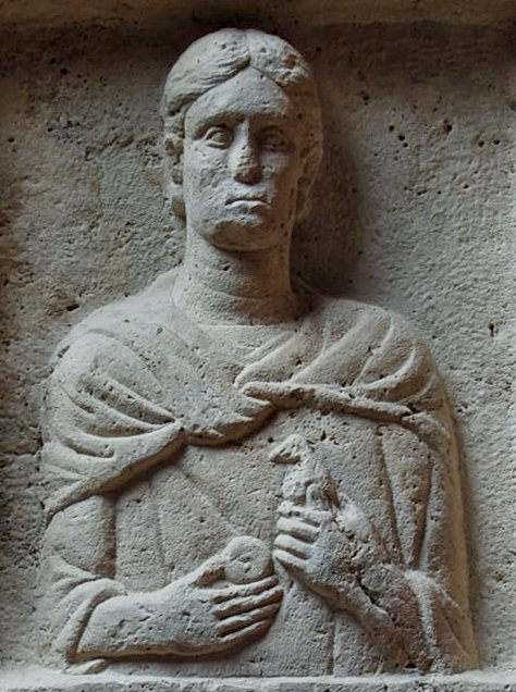 Im Haupbtbild in Rechtecknische Brustbild eines Mädchens: Mittelscheitel, gewelltes, hinter die Ohren gestrichenes Haar, Ärmeltunica, Mantel auf der Brust verknotet, in der Rechten Apfel, in der Linken Vogel. - Inschrift