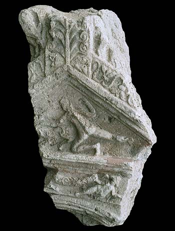 Im Giebelfeld Mythos (?): auf dem linken Bein kniender nackter Knabe (?) packt mit der Linken einen Hasen am Kopf, die Rechte ist erhoben, das rechte Bein nach hinten ausgestreckt. Auf den Schrägen Palmettenranke.
