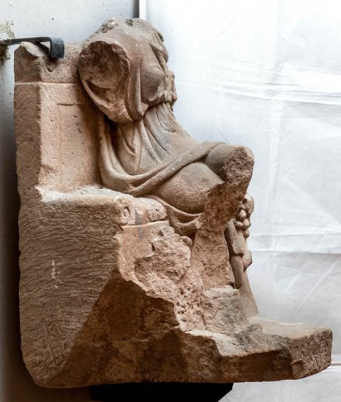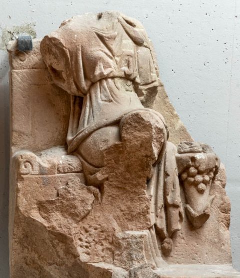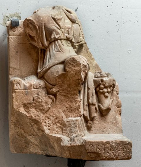 - Mythische Figur: thronende Fortuna mit Füllhorn neben dem linken Bein. Inschrift auf dem Sockel.