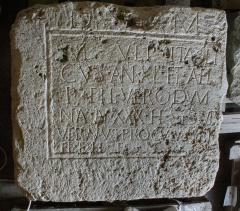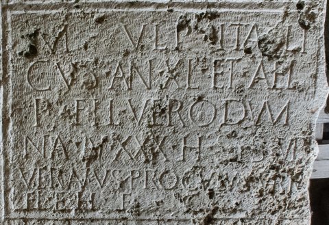 - D(is) M(anibus) // M(arcus) Ulp(ius) Itali/cus an(norum) XL et Ael(ia) / P(ublii) fil(ia) Verodum/na an(norum) XXX h(ic) s(iti) s(unt) Ulp(ii) / Veranus Proculus Verina / fil(ii) et h(eredes) f(aciendum) c(uraverunt)