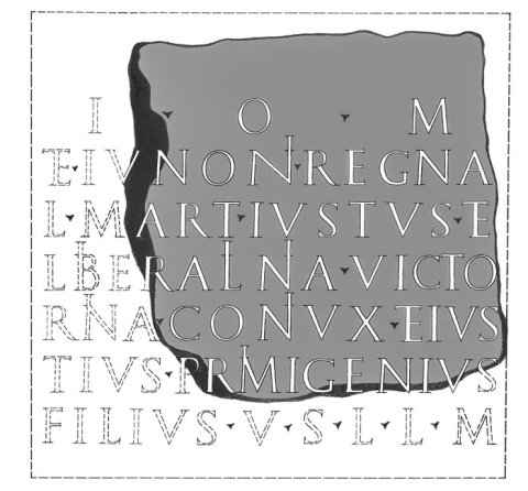 - [I(ovi) O(ptimo) M(aximo) / [Iu]noni Reg(i)na(e) / [M]art(ius) Iustus et / [Libe]ralinia Victo/[rina] coniux eius / [et P]rimigenius / [filius ---