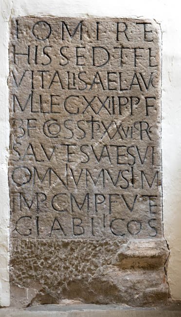 - I(ovi) O(ptimo) M(aximo) I(unoni) R(eginae) et / His(---) Sed(---) T(itus) Fl(avius) / Vitalis Ael(ia) Aug(usta) / mil(es) leg(ionis) XXII P(rimigeniae) p(iae) f(idelis) / b(ene)f(iciarius) co(n)s(ularis) stip(endiorum) XXVI pro / salute sua et sui(!) / omnium v(otum) s(olvit) l(ibens) l(aetus) m(erito) / Imp(eratore) Com(modo) P(io) F(elici) V et / Glabri(one) co(n)s(ulibus)