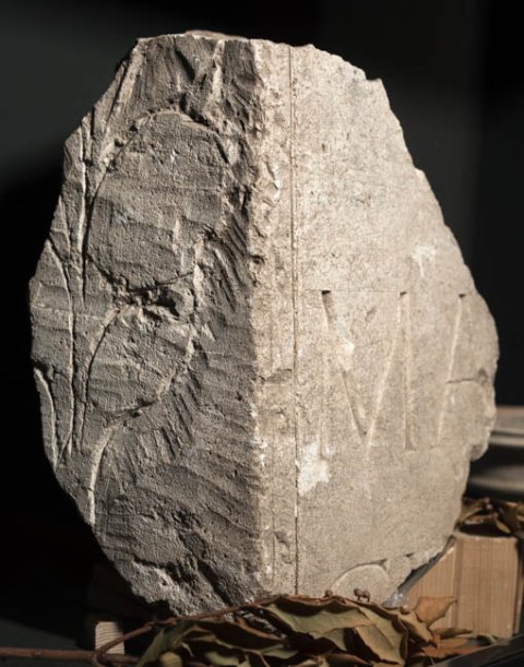 - Eckblock, auf der linken Nebenseite Pflanze (Ritzzeichnung)