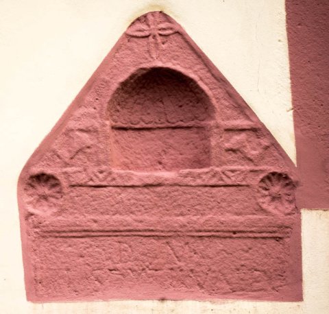 - Giebel mit Kreuzblatt in der Spitze, darunter Bogennische mit Muschel, seitlich je ein Capricorn (?), darunter Zackenband und seitlich Rosetten.