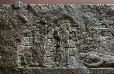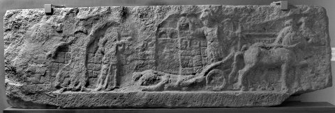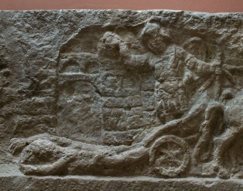 - Mythos (Troja). Schleifung des Hektor: rechts Streitwagen mit zurückgewandtem Achill, der auf Hektors Leiche herabsieht. Im Hintergrund und links die Mauern von Troja und in einem Bogen stehende Andromache, die sich die Haare rauft. Links eine weitere Frau mit ausgebreiteten Armen.