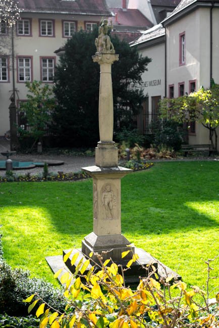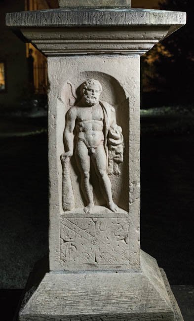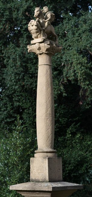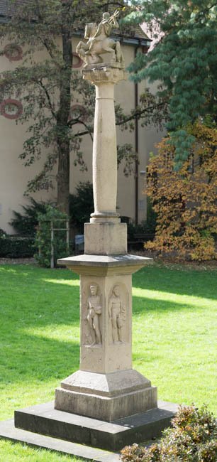 - Sockel: Viergötterstein mit Mercur, Hercules, Juno, Minerva. Zwischensockel mit Inschrift, auf Nebenseiten Ornament. Säule mit geschupptem Schaft, auf der Basis erste Inschriftzeile. Kapitell mit Büsten, darauf reitender Jupiter über Gigant.