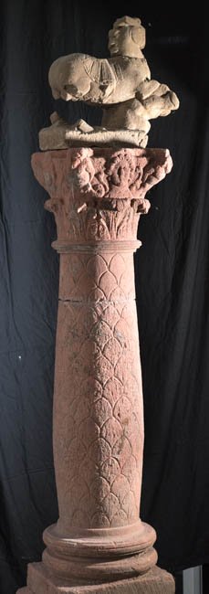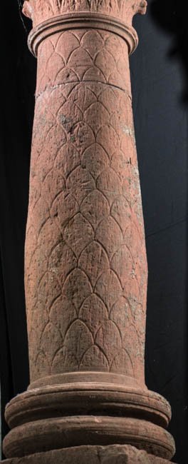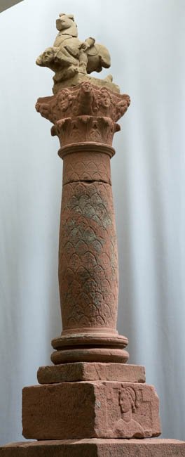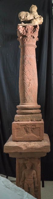 - Säule mit Plinthe, Doppelwulstbasis, geschupptem Schaft, Kapitell mit Jahreszeitenbüsten und Gigantenfiguren anstelle der Voluten.