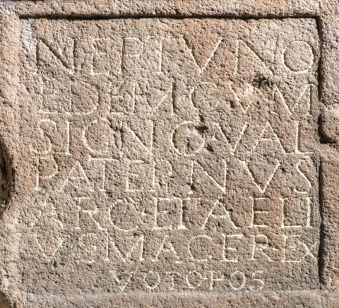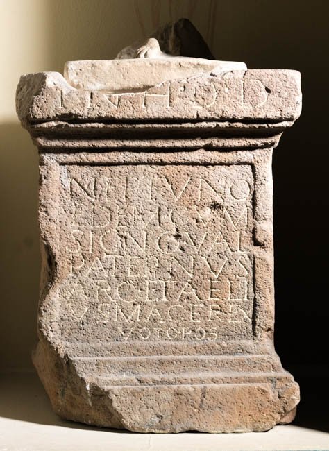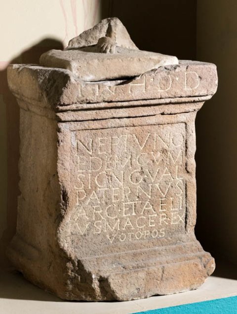 - In h(onorem) d(omus) d(ivinae) // Neptuno / (a)edem cum / signo Val(erius) / Paternus / arc(hitectus) et Aeli/us Macer ex / voto pos(uerunt)