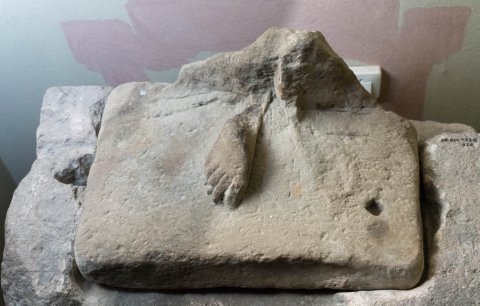 - Mythische Figur: altarförmige Basis mit eingesenkter Plinthe, darauf rechter Fuß und Umriss des linken Fußes, vor diesem Loch für den Dreizack des Neptun.