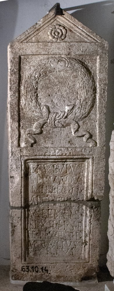 - L(ucius) Fulvius / Secundus / mil(es) leg(ionis) II / ad(iutricis) (centuria) Publili(i) / Valentis / st(ipendiorum) XII h(ic) s(itus) e(st) / he(redes) t(itulum) ex test(amento) p(osuerunt) / M(arcus) Travitus / et Ciltus