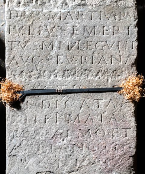 - Deo Marti (M)arm(ogio?) / Iulius Emeri/tus mil(es) leg(ionis) VIII / Aug(ustae) Severianae / [[Alexandrian[ae]]] / exactus co(n)s(ularis) / dedicata XIII K(alendas) Maias / Maximo et / Aeliano co(n)s(ulibus) / v(otum) s(olvit) l(ibens) l(aetus) m(erito)
