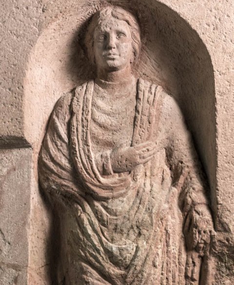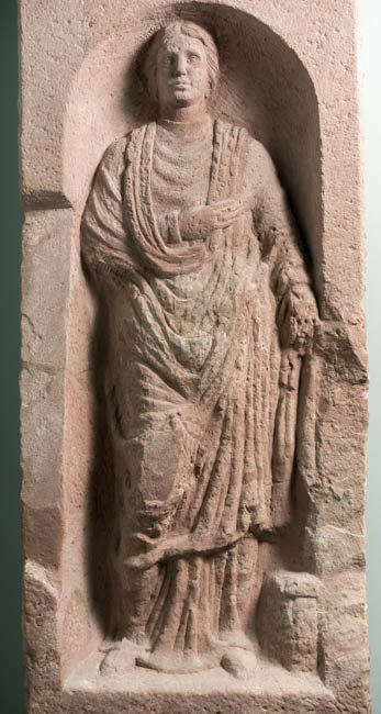 - Nische (Bogennische ?) mit stehender Frau in Tunica, Mantel und Schuhen, neben dem linken Fuß Behälter (?). Unterhalb rahmenlose Inschrift.