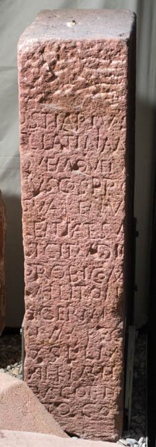 - ---] / Ostiariu(s) S[t]/[e]llatinian[u(s)] / quem Q(uintus) Vei(---) V[e]/tus co(n)s(ularis) pro / sua benivo/lentia et su[l]/licitudin[e](!) / prob(avit) com/militon[i]/b(us) German(orum?) / num(eri?) fec(it) / v(otum) s(olvit) l(ibens) l(aetus) m(erito) / VII K(alendas) Marti[as] / Fusco et De[x]/tro co(n)[s(ulibus)]