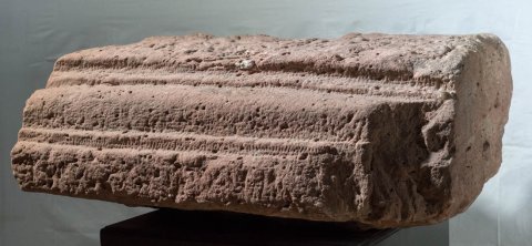 - Gesimsblöcke mit einfacher Profilierung auf einer Längsseite. Von den Tortürmen des Kastells Neuenheim.