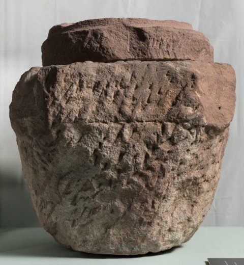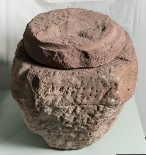 - Rundes Ossuarium aus einem ausgehöhlten und außen abgemeißelten Kapitell, runder Deckel aus Fragment einer Säulenbasis.