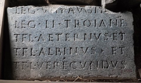 - ---] / leg(ionis) VIII Aug(ustae) i[te]m / leg(ionis) II Troian(a)e(!) / T(itus) Fl(avius) Aeternus et / T(itus) Fl(avius) Albinus et / T(itus) Fl(avius) Verecundus / LVIITIIEROI[---]ES / [---