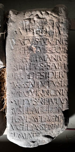 - [Ve]ratius(?) Iuvenis / [S]uperstius Secun/[du]s Primanius / [Pr]imitius Sabi/nius Desidera/[t]us Saplutius Le/[--]as Vinnonia / [-]attusa Livia A/[-]tusilla Pollioni[a] / Ursula Placid[ia] / Lucilla Senn[au]/sia Matto[---