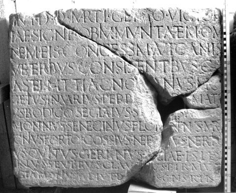 - In h(onorem) d(omus) d(ivinae) Marti Genio Victor/iae signif(eri) ob immunitatem om/nem eis concessam a vicanis / veteribus consistentibus Castell(o) Mattiac(orum) Novianius Mo/getius Ianuarius Perpetu[us] Damati/us Bodico Seglatius Statu[tu]s Atessa(tius) / Montanus Senecianius Flor[e]ntinus Marti/onius Fortio Cossius Ner[ti]nus Nertini/us Quintus Germanus Ibliae Isido/rius Severus Claudius Firmu[s] / Giamonius Adiutor Iustus Censorin[i]