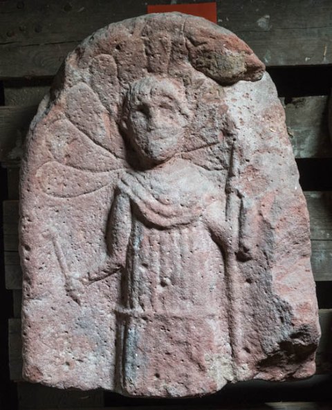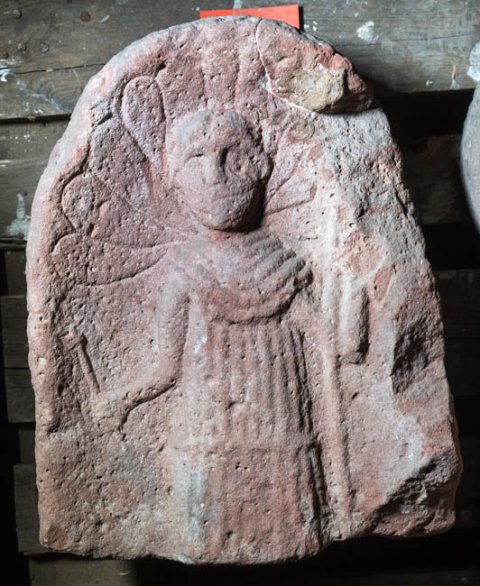 - Mythische Figur (Gott): stehende bekleidete Figur, in der Rechten Beil, in der Linken Stab, hinter dem Kopf Halbkreis von eingeritzten Zungenblättern.
