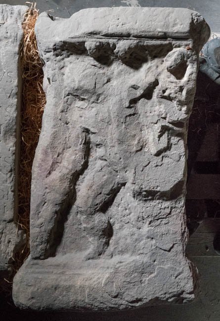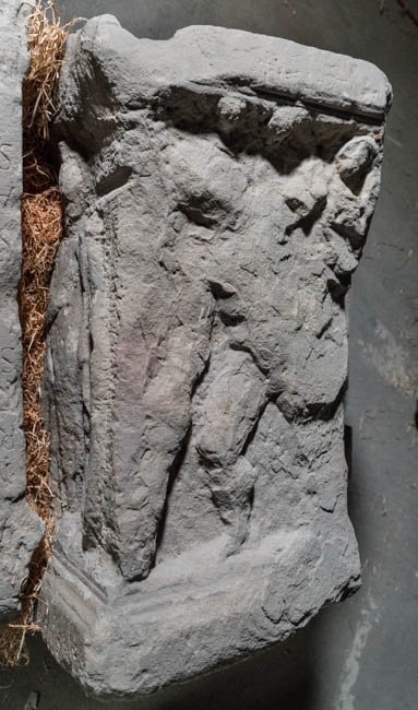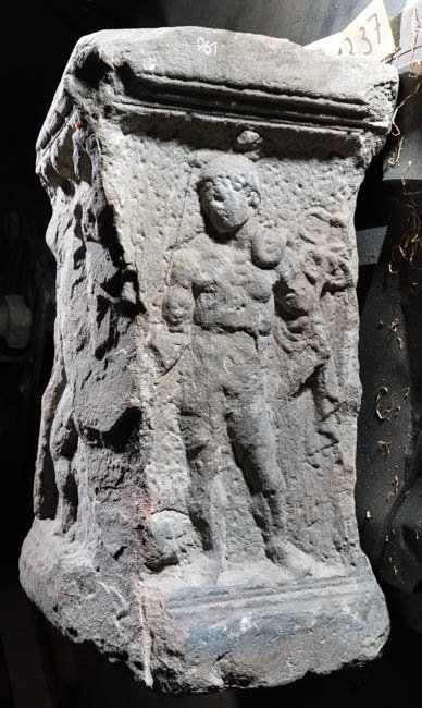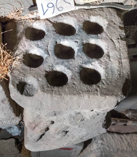 - stark bestoßen u. verwittert, auf der Oberseite 9 runde Eintiefungen (rezent)