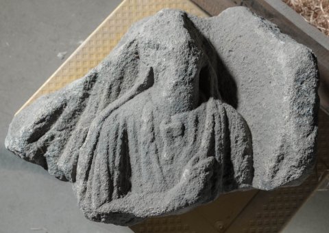 - Oberkörper einer bekleideten Frau (?) mit über den Kopf gezogenem Mantel. Grabrelief ?