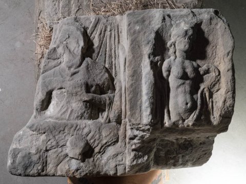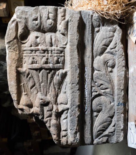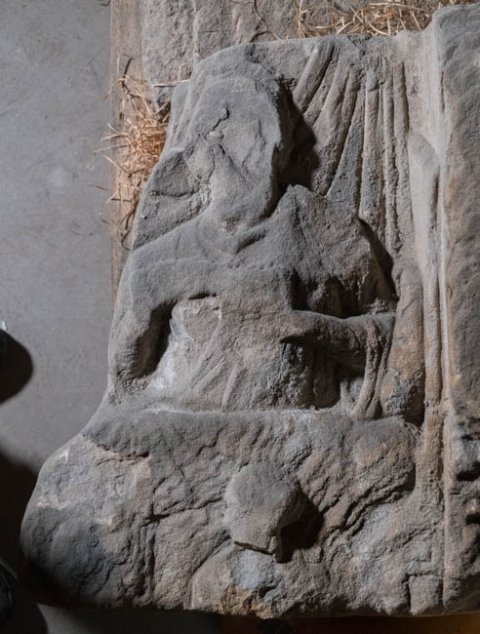 - Eckblock: auf der Vorderseite Rest eines Totenmahlreliefs mit gelagerter Person, hinter ihr Vorhang, im Vordergrund unten Kopf einer Dienerfigur. Rechts davon Rahmenfeld mit nackter weiblicher Figur (Mänade mit Schlange ?). Auf der rechten Nebenseite zwei vertikale Felder mit Blattkandelaber und Akanthusornament.