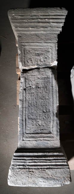 - stark verwittert, horizontaler Bruch, auf der Oberseite Fußrest (?)