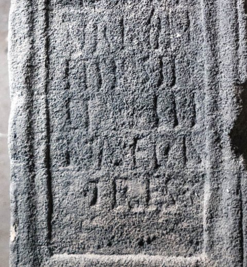 - gerahmtes Schriftfeld, auf der Rückseite Rahmenlinien (Giebel) eingeritzt