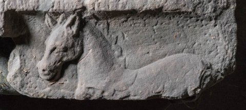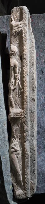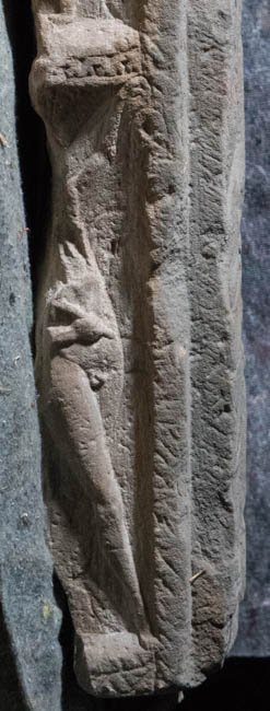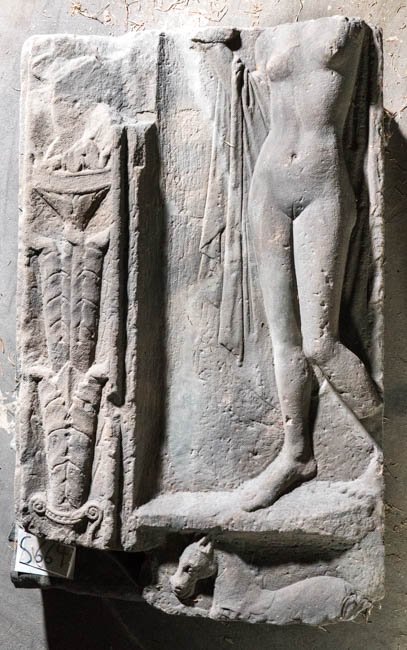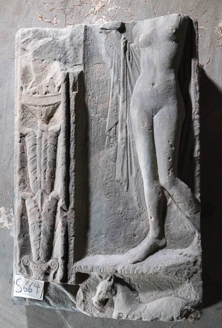 Block von der rechten Seitenwand eines Grabmals: auf einer Standleiste stehende nackte Frauenfigur (Venus ?), die einen Schleier hinter sich ausbreitet (auf der rechten Hand Attribut ?). Unter der Leiste Meerwesen (Hippokamp). Am Rand links Pilaster mit Blattkandelaber.