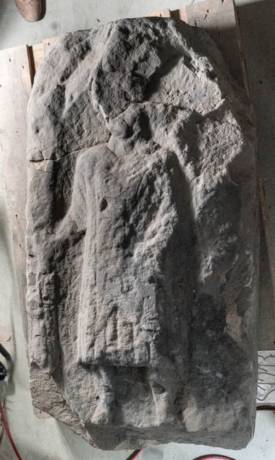 - unten abgebr., übrigen Kanten verbr., Oberfläche stark verwittert u. bestoßen