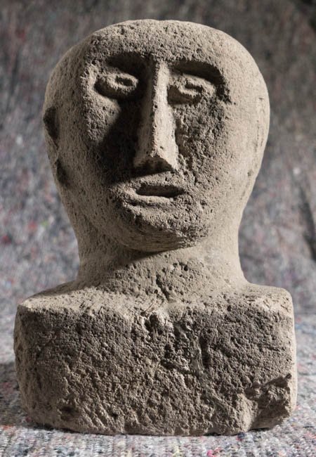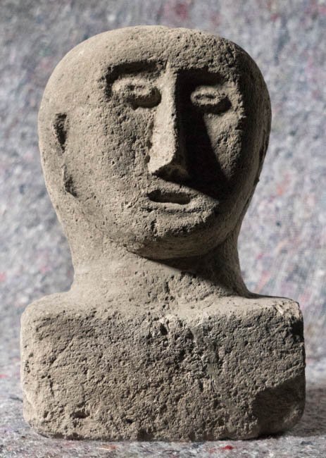 - Halsbüste eines Mannes auf eckigem Sockel, stark stilisierte Gesichtszüge