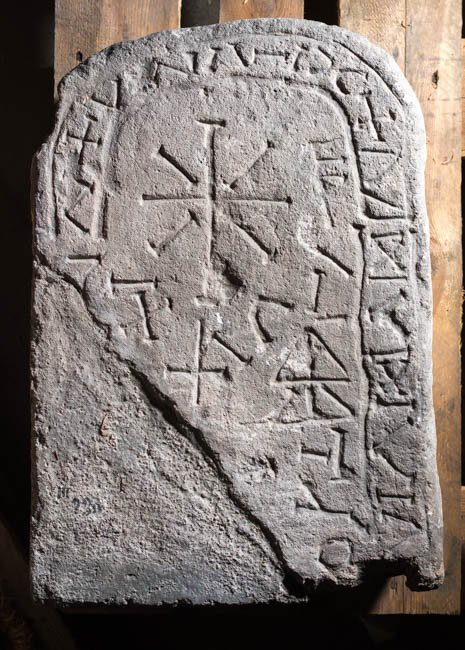 - Stele mit Bogenabschluss und Ritzdekor, am Rand umlaufende Inschrift