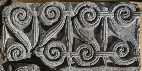 - Platte mit Reihe von gegenständigen, zusammengebundenen kannelierten S-Haken mit Spiralenden, dazwischen lanzettförmige Stäbe. Brüstungsgitter ?