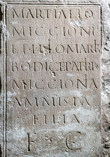 - D(is) M(anibus) / Martialio / Miccioni / et Ibliomari(a)e / Bodic(a)e patribu(s) / Miccionia / Ammisia / filia / f(aciendum) c(uravit)
