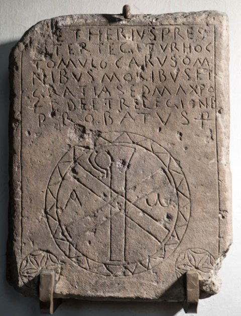 - unter Inschrift in Kreisrahmen mit Zackenband Christogramm mit Alpha und Omega, in den unteren Ecken der Platte je eine Kreisrosette (Ritzzeichnung).