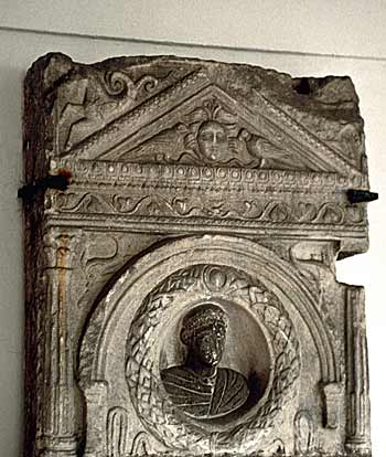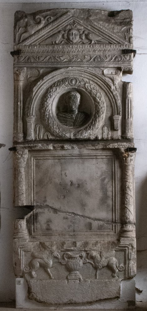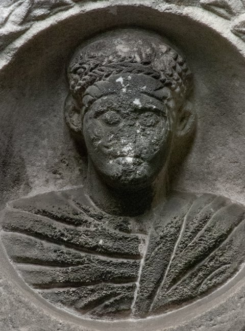 Hauptbild: kannelierte Säulen und Architrav mit Efeuranke, dazwischen profilierter Bogen auf kurzen Säulen, darin Kranz mit Clipeus und Tänien, der die Büste eines bartlosen Mannes mit Kranz und Toga rahmt.