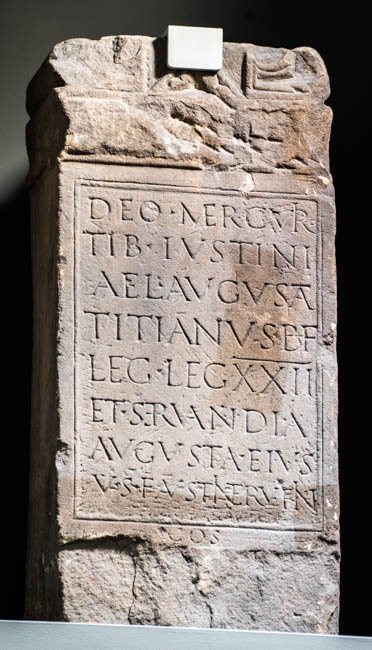 - Deo Mercurio / Tib(erius) Iustini(us) / Ael(ia) Augusta / Titianus b(ene)f(iciarius) / leg(ati) leg(ionis) XXII / et Servandia / Augusta eius / v(otum) s(olverunt) Faustino et Rufino / co(n)s(ulibus)